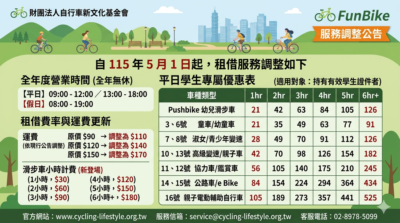 因年度合約更新,FunBike 租借站謹訂於115年5月1日起部分服務調整公告如下: